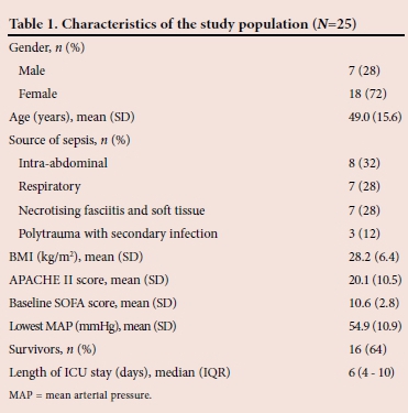 The baseline characteristics of the study population are given in Table 1. The mean (SD) baseline SOFA score was significantly lower in survivors compared with non-survivors of septic shock (9.8 (2.7) v. 12.2 (2.1), p=0.014).