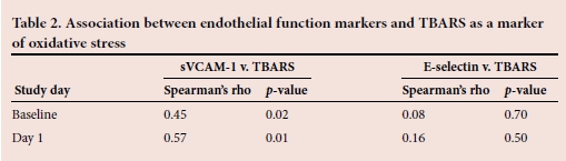 Since oxidative stress may influence endothelial dysfunction, the association between TBARS as a marker of oxidative stress and the biomarkers of endothelial function was tested. These results are presented in Table 2. A moderate but significant positive correlation was found between sVCAM-1 and TBARS at all the time points. However, no significant correlation was observed between E-selectin and TBARS at any of the time points.