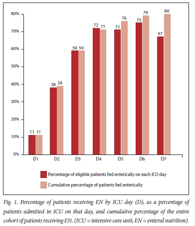 This was a retrospective analysis and potentially subject to the inherent biases associated with retrospective studies. The study was based upon a single centre, which may limit external validity. However, the study ICU is a busy referral centre for the second most populous province in SA as well as being a multidisciplinary ICU with a relatively even mix of patients. Therefore, the results are likely to be reflective of critical care in many multidisciplinary ICUs in the region. Issues of severely ill patients, limited numbers of dieticians and administrative delays in theatre and radiology are not well described academically but are familiar to most practising clinicians. It may be argued that given the nature of the severely ill patient cohort, EN would have been inappropriate in many patients de novo, and the data are thus skewed and overly negative. The aim of the study was not to find fault in the nutritional practices of the study ICU, but to describe the real-world application of nutritional support in an underexplored context. It has achieved this, and further interventional studies are required to further explore whether the barriers to nutritional support that have been identified are amenable to interventions or are unmodifiable factors in the clinical context. It may also be argued that the cohort is too heterogenous and that it is best to evaluate specific subsets of patients (e.g. medical versus surgical patients). Current international nutritional targets such as the recommendation to provide EN within 48 hours, are however generally interpreted as a standard target for critically ill patients, and as such it is reasonable to explore whether a multidisciplinary cohort of critically ill patients can achieve these targets, and if not, why not.