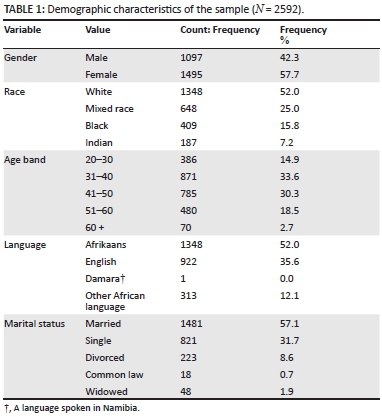 Table 1 shows the distribution of the sample (n = 2592) by current age, gender, race, language and marital status.