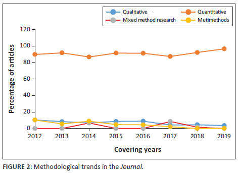 The SAJEMS was chosen as a case study because this study is based on the previous study conducted on the articles published in the Journal in 2015. Secondly, the content of the Journal is freely accessible, as it is an open access journal. Accessibility of the content of the Journal was one of the major considerations in selecting the journal. The scope of the Journal is interdisciplinary research in EMS and a 'leading South African-based publication' (Journal information [SAJEMS] 2020). That makes the Journal a perfect candidate for testing the utilisation of MMR by its contributors to find out if they are exploiting the potential of MMR to support interdisciplinary and multifaceted research and thus break down 'intellectual silos' (Journal information [SAJEMS] 2020). The study period was from 2012 to 2019, which is sufficiently long enough to determine the essence of scholarly communication in a field. A generally recommended time span for measuring scholarly communication is 5 years or more (Pendlebury 2010).