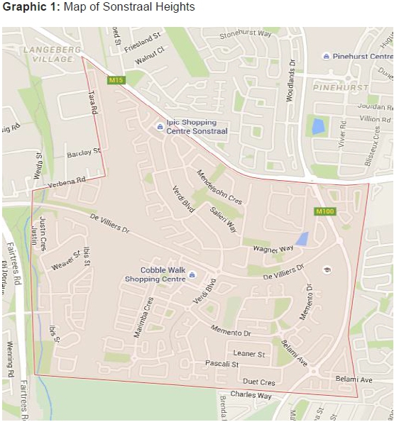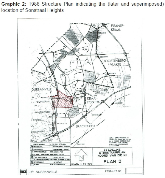 The most important planning instrument that made provision for a hierarchy of roads over Erf 10357 is the 1988 structure plan. It burdened the property with a planned primary road system consisting of an order 122road, North/South, namely the Kuilsriver highway,23 and two order 224roads, namely the East/West De Villiers Drive extension25 and the North/South Brackenfell Boulevard in the East. The Sonstraal Heights subdivision is superimposed on the structure plan below with all three roads clearly indicated.