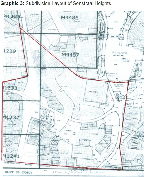 A subdivision or "township development" means an area of land divided into erven, and may include public places and roads indicated as such on a general plan.38 The graphic below indicates the subdivision layout as envisaged by Arun Property Developers (Pty) Ltd.