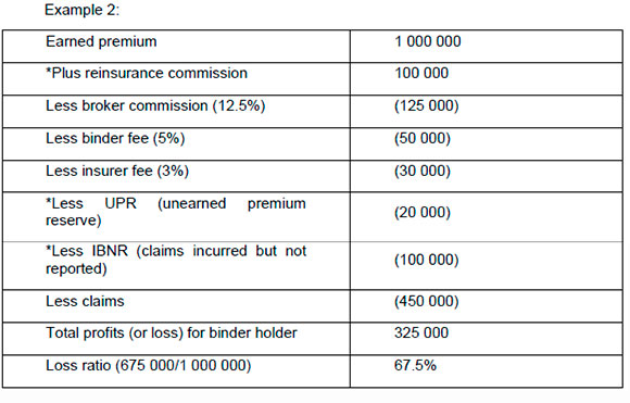 Generally, the binder holder agreement between the insurer and the binder holder could either agree with example 1 (to exclude reinsurance commission etc.) or example 2 (to include reinsurance commission etc.). The consequence of this is clearly evident in example 2 above - a lower loss ratio. Therefore, the binder holder is more profitable and could share in a larger amount of profits.