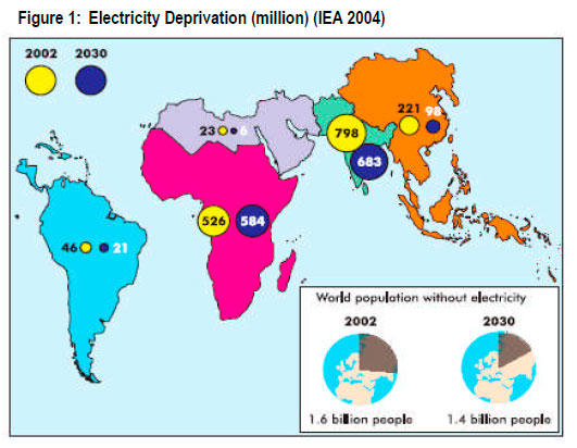 The map of the world population without electricity for 2002 and projected to 2030 is shown in Figure 1. The startling reality is that it is projected that electrification levels in sub-Saharan Africa will decrease rather than increase from now to 2030.