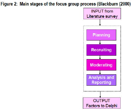 The main stages of the focus group process are: planning, recruiting, moderating, and analysis and reporting as depicted in Figure 2 (Blackburn 2000). During the planning stage, the researcher familiarised herself with the focus group technique and did a literature survey on sustainable energy selection factors.