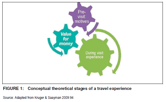 As could be deducted from Figure 1, a travel experience is initially influenced by motives and if these have been satisfied, the tourist will experience a sense of receiving value for money, which could be interpreted as receiving quality for a price paid (Barnett, Barr, Christie, Duff, & Hext 2010:6; Du Plessis & Saayman 2013:133).