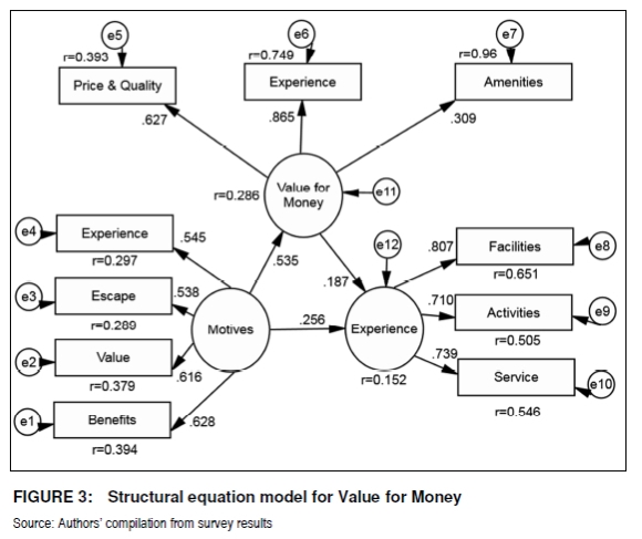 The last finding of the study is the confirmation of the relationship between motives, value for money and experience, and provides an answer to the research question, namely whether a relationship between these three constructs exists. This finding thereby confirms literature (Meng et al. 2008; Parasuraman & Grewal 2000; Schoeman 2010; Yang & Peterson 2004) that states that tourists will feel satisfied when the initial motive for travelling is fulfilled and that they perceive it as value for money.