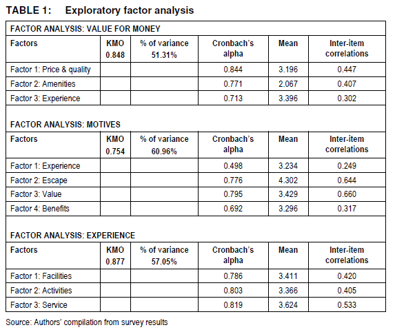 Between all the constructs factors, the reliability coefficient proved to be relatively high, ranging respectively from 0.498 (the lowest) to 0.844 (the highest). The average inter-item correlation coefficients varied between 0.249 and 0.660, which implies internal consistency for all factors. The Kaizer-Meyer-Olkin measure of sample adequacy of 0.848 for value for money, 0.754 for motives and 0.877 for experience also indicated that patterns of correlation are relatively compact and thus yield distinct and relative factors (Field 2009:647).