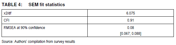 An acceptable ratio for the chi-square divided by its degrees of freedom is between 2.0 and 5.0 (Tabacknick & Fidell 2007:542). Values for the comparative fit index (CFI) should vary between 0.0 and 1.0, with values closer to 1.0 indicating a good fit (Hooper et al. 2008:54). According to Blunch (2012:115), models with RMSEA values of 0.10 > should not be accepted.