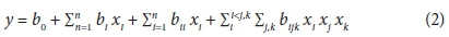 Where, y is the response variable to the model input variables; xi,, xj. and x,. The terms bo„, bi., bii.. and bijk... represent the offset terms or the intercept, the linear coefficient, quadratic coefficient and the (ijk)thinteractive coefficient, respectively.