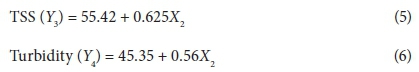 Table 2 shows the statistical analysis of the derived models for the various responses. The best model was selected based on how low the standard deviation or how high the actual R2and predicted R2values are for each corresponding water quality. The quadratic models were selected for COD and SOG with standard deviation, actual and predicted R2 values of 1.7, 0.94, 0.84, and 3.26, 0.91, 0.90, respectively. Although in all cases, the cubic model shows high actual R2values, it lacks the ability for prediction and hence was not considered. In terms of turbidity and TSS, the most appropriate model considered was the linear model with 2.55, 0.75, 0.68, and 2.46, 0.81, 0.66, as the standard deviation, actual and predicted R2 values, respectively.