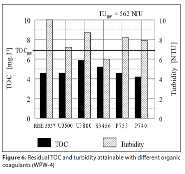 TOC and DOC removal efficiencies attained by various organic coagulants under operational conditions at several Eastern Cape waterworks are shown in Table 2. The results obtained are expressed by percentage removal with respect to the composition of the raw water.