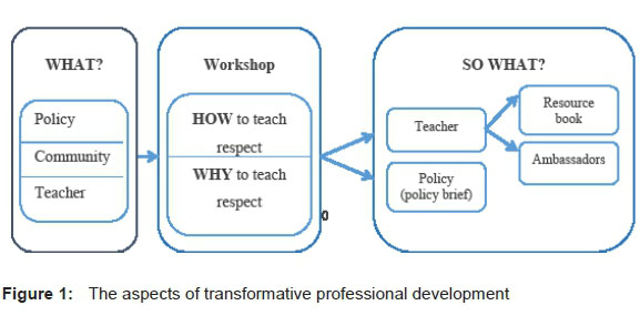 Policy and research have been advocating the importance of teachers in achieving equity and teachers are called to act as agents of social justice. This issue remains central to the development of a post-apartheid South Africa, where a need for reconciliation and healing still dominates the society. Such a landscape requires adequate support through transformative professional development. In this paper we analyse the design of the intervention 'Teaching Respect for All' that aims to empower teachers in South Africa to act as agents of social justice. Based on the literature review, content analysis of the intervention's manual and resource book, and interviews with stakeholders we explore if the intervention outline can support teachers in becoming agents of social cohesion. The qualitative content analysis of the data unearthed four aspects of the intervention: the what, the how, the why, and the so what. We argue that while the intervention enables an alteration of teaching practice, altering teachers' beliefs is a long-lasting and more challenging task. We conclude the paper with recommendations for transformative professional development programmes and the value of such for socially just education in South Africa.