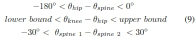 3) Joint Angles: The generalized coordinates, (2), used are absolute angles, therefore to constrain the motion of the limbs to a feasible range, constraints on the relative angles were enforced. These constraints force the legs to obey the "X" configuration (both knees pointing inwards), as seen in Fig. 2. Similar constraints were applied for the velocity of the limbs. For the revolute spine, constraints were imposed on the spine angle, limiting the relative angle to 30 degrees [6]. These constraints took the following form: