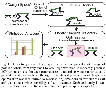 This study aims at providing general insight into the optimal spine morphology for rapid acceleration (and deceleration) maneuvers. The work presented here is an extension to our previous effort [28], which focused purely on rapid acceleration with a prescribed gait pattern. This research has been expanded by analyzing a full trajectory (containing an acceleration, steady-state and deceleration phase) while allowing the optimizer to choose the gait pattern (using contact-implicit optimization methods) and allows the feet to slip (a friction cone was enforced). This research is limited to the planar case and follows a similar methodology to [29]. Due to the complexity of these simulations, and the computational requirements (2 months to complete the simulations on 12 identical computers), only acceleration and deceleration maneuvers of planar quadrupeds (100 randomly generated robots) with a rigid, revolute and prismatic spine were analyzed and compared, summarized in Fig. 1.