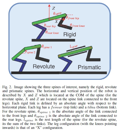 From analyzing the animations of all the results, a number of trends emerged. When the hind legs land, they begin to swing backwards, while the front legs swing forward. When the front legs land, they swing backwards while the rear legs swing forward, matching what is observed in [45]. For the revolute robots, when the rear leg is on the ground, the spine extends, effectively increasing the stride length and pushes the front legs forward. When the front leg is on the ground the spine contracts, pulling the rear legs forward. This spine motion is observed in [45]. Similar observations were made in the prismatic spine robots. When the rear legs were on the ground, the spine extends and pushes the front legs forward, increasing the stride length. When the front legs were on the ground, the spine would contract pulling in the rear legs.