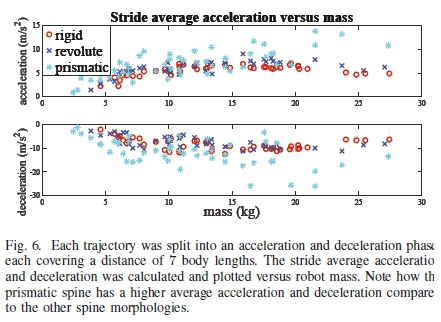 Calculating the work done on forward motion [28], (13), per robot revealed that the prismatic spine exerted, on average, 37% more forward work than the rigid robot and 28% more than the revolute robots.