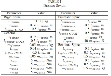 Following our previous study [28], [31], 100 randomly generated robot parameters from the design space, Table I, were used. For an explanation of the symbols, see Fig. 2. In order to improve the chances of generating feasible robots, the parameters were normalized with respect to the spine length to ensure a robot, for example, with a large spine did not have short legs. This limits the design space, but makes this initial study tractable.