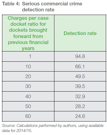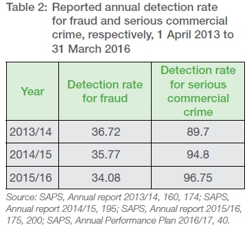 The SAPS does not report a detection rate for general, less serious commercial crime. However, it does report a detection rate for fraud (see Table 2).