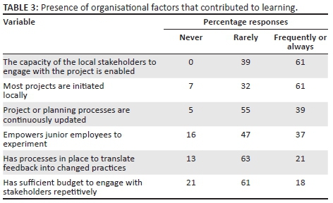 In contrast to personal learning factors, fewer participants believed organisational factors that promoted social learning were present. Sixty-one per cent of respondents indicated that the enabling of stakeholders' capacity and promotion of locally initiated projects were always or frequently present (Table 3). Factors such as continuous updating of planning processes and empowerment of junior employees were regarded as being frequently or always present by only 39% and 37% of respondents, respectively, while factors such as acceptance of feedback and adequacy of budgets were regarded as being frequently or always present by only 21% and 18% of respondents, respectively.