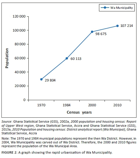 Several intercensal reports (see Figure 2) on Wa reveal a significant growth in the area's population. The population of Wa increased from 29 804 in 1970 to 60 113 in 1984. It further increased to 98 675 in 2000 and subsequently to 107 214 in 2010 (GSS 2002b, 2013a). The 2010 population census report reveals that the municipality recorded the highest concentration (66.3%) of urban dwellers as against the regional and national figures of 16.3% and 50.9%, respectively (GSS 2013a, 2013c). Indicatively, although Wa is the least urbanised in the hierarchy of regional capitals in Ghana, it is indeed experiencing rapid growth.