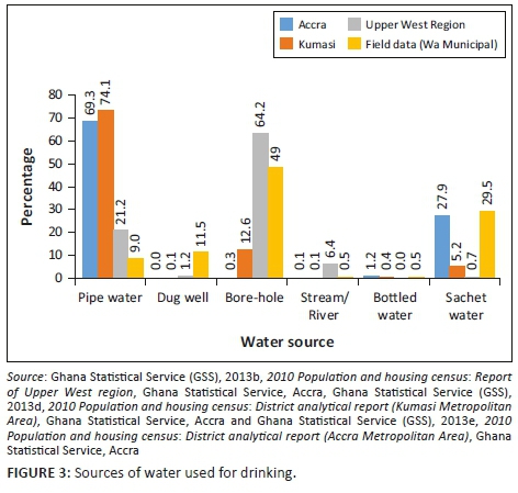 Figure 3 presents the various sources of drinking water used in the communities. The findings show that only 9% of respondents have access to piped water against the regional urban coverage of 21.2% and national coverage of 64.4% (GSS 2013c). This deficiency in piped water supply in Wa re-echos the situation in most large metropolitan areas, where water supply to some communities is compromised. A case in point is where 69.3% of the 1 665 086 population in Accra and 71.1% of the 1 730 249 population in Kumasi have access to piped water. The results resonate with the urban penalty paradigm, which, as already indicated, posits that cities concentrate poor people and expose them to unhealthy physical and social environments, as well as, in this case, lack of supply of potable water (Freudenberg et al. 2005).