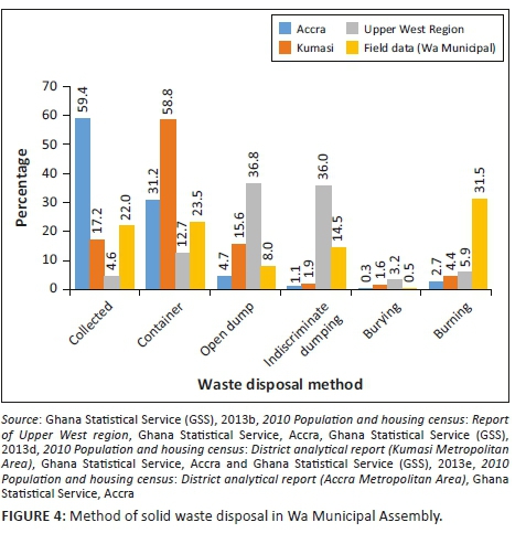 SWM among residents in Wa Municipality takes various forms and practices. The study uncovered that (see Figure 4) less than half of the population (45.5%) have their waste collected through door-to-door collection and central communal container (CCC) systems, respectively. Per data collected from the Environmental Health Unit of the Wa Municipal Assembly, the city has only 40 communal containers. Meanwhile, the findings revealed that most residents are unable to patronise the door-to-door waste disposal method, which costs Gh⊄30.00 for registration and a monthly commitment fee of Gh⊄10.00 at the time of the study. As a result, open drains, uncompleted houses and open spaces in Wa have become a receptacle for plastics and empty water sachets. This condition depicts a lagging situation in SWM in Wa compared to other large cities such as Accra and Kumasi, where a significant number of people (see Figure 5) patronise CCC and also have their solid wastes collected. The discouraging SWM practices in Wa confirm earlier statistics, which show that only 4.6% and 12.7% of the population have their solid waste collected through the door-to-door and CCC systems, respectively (GSS 2013a).