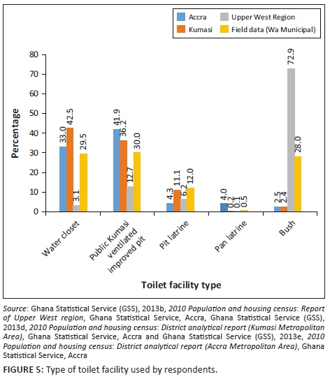 The challenge of access to improved sanitation in Wa Municipality is low. The study found that (see Figure 5) less than a third of respondents (29.5%) use water closets. This reflects the general situation in the region where only 3.1% of the population use water closets. The low sanitation coverage undoubtedly accounts for the 72.9% of the region's population engaging in open defecation. Consequently, the lack of sanitation facilities in most communities has resulted in 30% of the respondents using public toilets (Water Closet/Kumasi Ventilated Improved Pit [WC/KVIP]). The limited number of public KVIPs (46) in the municipality has compelled a significant number of respondents (27%) to engage in open defecation, literally known as the 'free range'. A major cause of this environmental challenge in Wa is the complexity of increasing demand for housing, inadequate planning, inefficient enforcement of building laws and indiscipline, which has given landlords the leverage to build houses without sanitation facilities. The situation mirrors the dreadful sanitation in Accra and Kumasi, where less than half of the population use water closets. Thus, many residents rely on public toilet facilities while others use pit latrines and engage in open defecation.