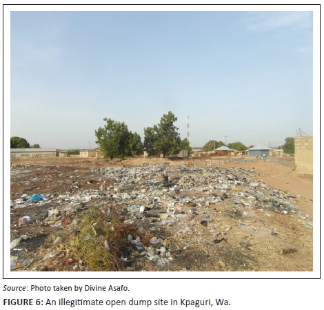 Figure 6 shows an illegitimate open dump site in Wa. According to the Assemblyman for Kpaguri, dumping in this area is usually done at night or at dawn when people are asleep. This spatial disparity in solid waste disposal practices reflects the situation in the largest cities in Ghana where the high-income areas patronise door-to-door collection services while the low-income areas struggle with a few communal containers, which are always left spilling over and uncollected. A daunting implication for the health of the population, therefore, includes the contracting of upper respiratory tract infections from smoke emitted from burning waste. Coupled with this challenge is the potential flood risk threatening most residents as a result of the choking of open drains with solid waste, a situation identified as a major contributing factor to flooding occurrences in Ghanaian cities (Oppong 2011).