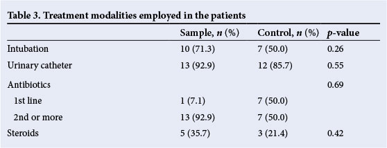 During the study period, 2 266 children aged 0 - 12 (average 2) years were admitted to the PICU in Grey's Hospital. Even though the number of patients with HIV infection was higher in the control compared with the sample group (28.6% v. 21.4%), more patients in the sample group were severely immunocompromised (14.3% v. 7.1%). Donowitz et al. [10] revealed that HIV-infected children and those with prolonged steroid treatment have a significantly reduced immunity which, in turn, is a major risk factor for the acquisition of nosocomial infections. Although not statistically significant, a similar trend was seen in this study, with a higher proportion of patients in the sample group receiving steroids.