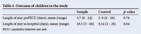Table 4 shows the outcome of children in this study. The duration of hospitalisation before a positive blood culture ranged from 2 to 14 days. Children in the sample group spent more time in hospital prior to admission to the PICU than those in the control group (3.7 v. 2.9 days, range 0 - 21 v. 0 - 26 days, respectively). The total period of hospitalisation of children in the sample group was double that of those in the control group (18.5 v. 9.1 days, range 5 - 60 v. 2 - 29 days, respectively), which was statistically significant (p=0.04).