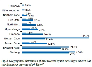 Most poisoning enquiries were received from the Western Cape (n=384, 34.9%) (Fig. 2) and the majority were made by healthcare professionals (n=659, 59.9%) (Fig. 3).