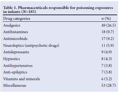 Table 1 shows the pharmaceuticals responsible for poisoning in infants, with analgesics being the most common group of drugs (n=49, 26.5%). Paracetamol was involved in 23 cases (47.0%).