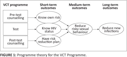 From Figure 1 it is clear that the VCT programme aims to achieve short, medium and long term outcomes relating to the HIV and AIDS risk and status of an individual. The short term outcomes relate to knowledge acquisition of HIV and how it is transmitted. Medium term outcomes are associated with changing risky sexual behaviour to safer sex. The long term outcomes include the reduction in the number of HIV infections and transmission of the virus. It is understood that if VCT is able to achieve its short term, medium term and long term outcomes, it will ultimately be perceived as an effective tool that combats the HIV and AIDS pandemic.