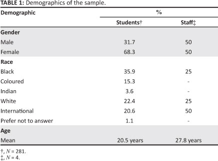 In Table 1 the gender, race and age demographics, by student and staff participants, are shown.