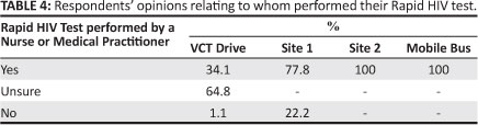 The quality of pre-test counselling showed slight differences across sites, but was generally ranked positively. As regards the Rapid HIV test, two thirds of the participants were unsure about the professional status of the person performing the test. This is problematic. According to the programme description, the Rapid HIV test can only be performed by a nurse or a medical practitioner (Coetzee & Patel, 2000). Informing the participants that their Rapid HIV test is being performed by a nurse or medical practitioner may increase the credibility of the VCT service. It may also reduce any concerns they may have about whether or not the correct protocols are being followed in relation to the Rapid HIV test. Participants rated the quality of the post-test counselling across all four sites positively. According to Day et al. (2003) and UNFPA (2002) the fidelity of this step is crucial as it provides participants with risk reduction strategies.