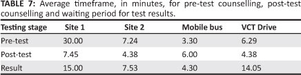 The waiting time to receive one's HIV result is much longer at the VCT Drive on the main campus compared with the Mobile Bus and Site 1. This could be a result of the high uptake during the VCT Drive and the practice of three different programme staff performing the three respective programme activities. At other sites, there is a lower uptake and one individual performs all three activities. Rapid feedback of test results is necessary for the success of the VCT programme (Bhagwanjee et al., 2008; Mundy & Dickinson, 2004). The evaluators suggest that more staff should be appointed during the VCT Drive in order to conform to VCT protocol standards for rapid feedback.
