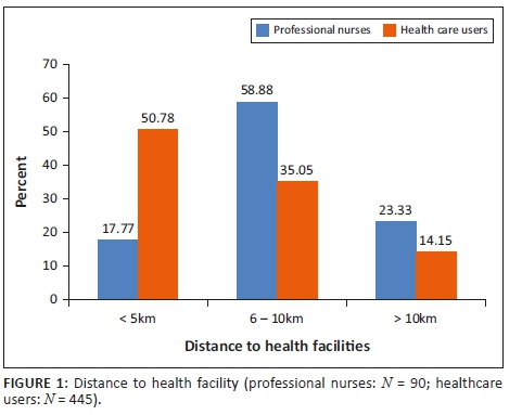 One of the key factors of accessibility to healthcare services is ensuring that people living in rural areas have access to trained health workers, but 60% of the nurses (n = 86; f = 54) and 44.94% HCUs (n = 445; f = 200) perceived a shortage of nurses as a challenge. HCUs (44.94%) reported a waiting time of more than an hour at health facilities that were manned by only one or two nurses. The nurses (n = 86; f = 54; 60%) reported a work overload at the health facilities where there were fewer than two nurses, contributing to the long waiting time as described by the HCUs (n = 445; f = 245; 55%). It was interesting to note that only 23.25% of the 90 nurse respondents were trained midwives, but each nurse was expected to provide antenatal, intrapartum and postpartum midwifery care (Table 2). The shortage of nurses affected follow-up on defaulters, as indicated by 72.22% of nurses, thus negatively affecting the treatment outcome of tuberculosis and other chronic diseases. This shortage of health workers at the rural health facilities contributes to HCUs (n = 445; f = 140; 31.53%) having to travel long distances to district hospitals, which has a severe impact on their meagre financial resources.