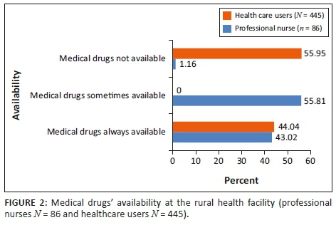 Medical drugs play an important role in saving lives, and nurses perceived the shortage of medicines as their greatest challenge when providing healthcare in rural areas. According to the nurses (n = 90; f = 87; 96.66%), medical drugs were supposed to be delivered on a quarterly basis, but deliveries lacked consistency in both the quantity and type (n = 90; f = 48; 46.7%) ordered. Similarly, HCUs viewed access to medical drugs as a challenge, with 59.95% of HCU respondents (n = 445; f = 249; 59.95%) reporting failure to obtain medicines during their last visits to health facilities in the rural areas (Figure 2). The nurses (n = 90; f = 68; 75.55%) reported that medical drugs for chronic conditions were rarely available and that this had a negative impact on the treatment of patients. The non-availability of medical drugs leads to a high risk of relapse and non-adherence by patients suffering from chronic diseases, which has a negative impact on the health outcomes in a community or country.21
