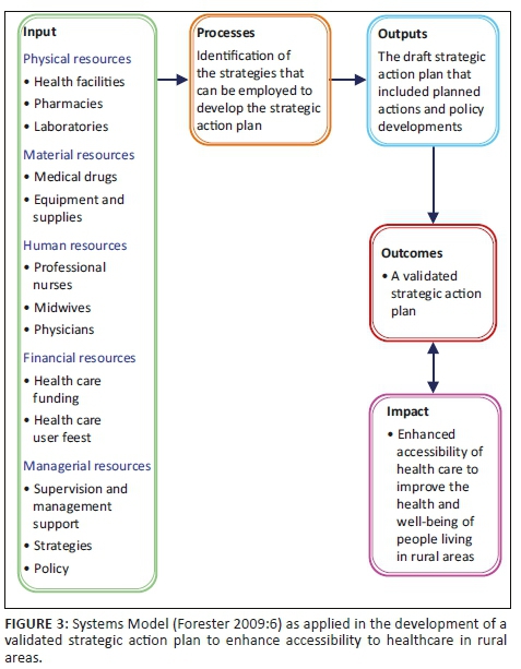 A self-administered questionnaire for the nurses and a structured interview questionnaire for the HCU respondents were developed. The questionnaires were developed based on a literature review on accessibility of healthcare. The questions were based on the inputs needed to enhance access to healthcare, as described within the Systems Model illustrated by Forester 2009 (Figure 3).20 The questionnaires were assessed for validity by the two supervisors and the statistician, as well as the appointed scientific review committee. The instruments had been pre-tested by purposely selected professional nurses (four nurses) at two health facilities and 20 HCUs in the catchment areas before the data collection commenced.