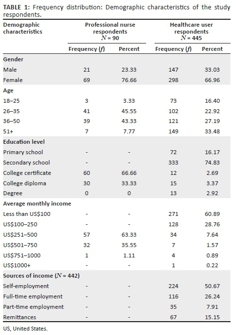 METHODS: A self-administered questionnaire (for professional nurses) and a structured interview questionnaire (for HCUs) were utilised to gather data in a cross-sectional survey. Two districts were randomly sampled from 59 districts. All nurses working in 45 public health facilities in the selected two districts, who were willing and available to participate, were included. Ninety nurses participated in the study. The HCUs were selected through a multistage sampling technique. The sample size for HCUs was calculated by using Dobson's formula, and 445 HCUs were included via convenience sampling.