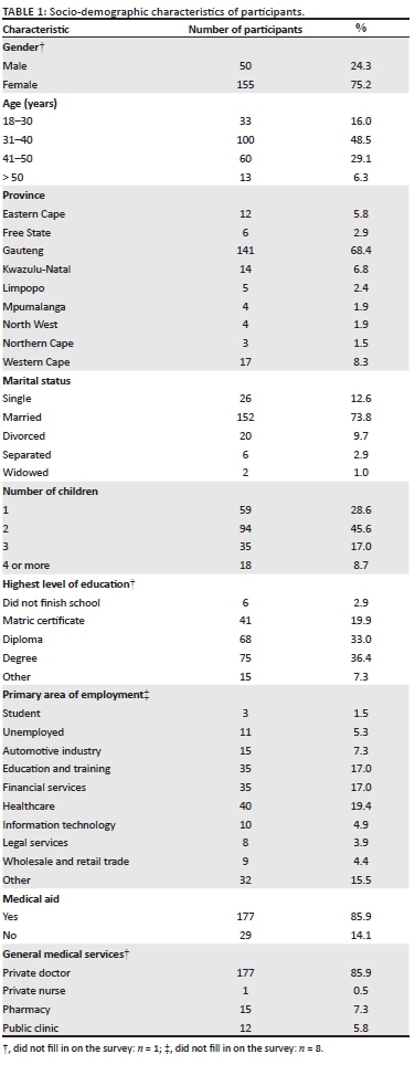 Most of the participants indicated that they had a qualification post finishing school (76.6%, n = 158), with the highest level of education reported as a master's degree. The primary area of employment was diverse with healthcare (19.4%, n = 40) being reported the most, followed by education and training (17%, n = 35) and financial services (17%, n = 35). The majority of respondents had private medical aid (85.9%, n = 177) and made use of private physicians (85.9%, n = 177) for their medical services and needs.