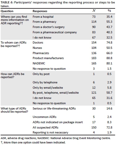 Table 4 presents frequency counts (where more than one option could have been indicated) and percentage to questions regarding the ADR reporting process. When asked about where could more information on ADR reporting be found, a pharmacy was the selection for majority of the respondents (n = 114) with the remaining selections being a doctor's surgery (n = 90), a pharmaceutical company (n = 83) and a hospital (n = 73). A small number of participants believed that only healthcare professionals should report ADRs (n = 32), similar to those that believed that only patients should report ADRs (n = 30).