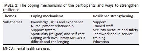 RESULTS: Narrative responses to two open-ended questions (How do you cope with providing mental health care to involuntary admitted mental health care users? and; How can your resilience be strengthened to provide mental health care to involuntary mental health care users?) yielded coping mechanisms and resilience strengthening strategies.