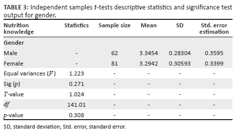 The study's first hypothesis sought to investigate if there is a significant difference between men and women regarding nutrition knowledge. Table 3 reports on the results of this analysis. The independent samples t-test was undertaken and the mean score for men was 3.35, with a standard deviation (SD) of 0.28. The mean score for women was observed as 3.30, with an SD of 0.31. Equal variances were assumed, with F = 1.223, Sig. (p) = 0.271 giving the t-value = 1.024 and degrees of freedom = 141.000. From these figures, a p-value of 0.308 was obtained, indicating that the difference between means was not significant. In other words, amongst the youth in this study, the nutrition knowledge of men and women does not differ significantly.