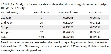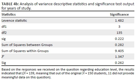 The second hypothesis sought to determine whether the number of years of tertiary education has a significant effect on the nutrition knowledge of the youth. The thinking here is that as the youth complete more years at a tertiary institution, their nutrition knowledge should increase proportionately. In other words, those who have only completed a few years of tertiary education will most likely have less nutrition knowledge than those who have studied for longer. To investigate this hypothesis, a one-way independent ANOVA was undertaken. The ANOVA output (descriptive section) shows that first year students had a mean score of 3.43, SD of 0.193 and a standard error (SE) of 0.064. The second year students had a mean score of 3.230, SD of 0.31 and SE of 0.07. Finally, the third year students had a mean score of 3.330, SD of 0.260 and SE of 0.04. To determine if these differences between the four groups were significant, the following figures were observed: F (3.135) = 1.347, p = 0.262. This is reported in Table 4a and Table 4b. (Based on the responses we received on the question regarding education level, the results indicated that N = 139, meaning that out of the original N = 150 students, 11 did not provide meaningful data on this question.)