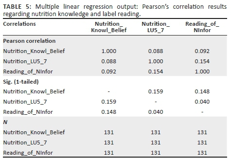 To investigate whether nutrition label use and reading of nutrition information predict nutrition knowledge, a multiple linear regression was undertaken (see Tables 6-8). A positive but non-significant Pearson's correlation was observed between the predictor variables and the explanatory variable. Thus, a correlation of 0.088 was observed between nutrition label use and nutrition knowledge. This was observed through the regression analysis (r = 0.092) between reading of nutrition information and nutrition knowledge.