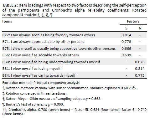 Factor 5i was identified as positive inclination towards others (mean = 4.08, SD = 0.70), as the items on this factor indicated an openness and positive perception towards other persons. Factor 6 was identified as positive inclination towards self (mean = 2.79, SD = 1.02), as it refers to being positive towards oneself (Table 2).
