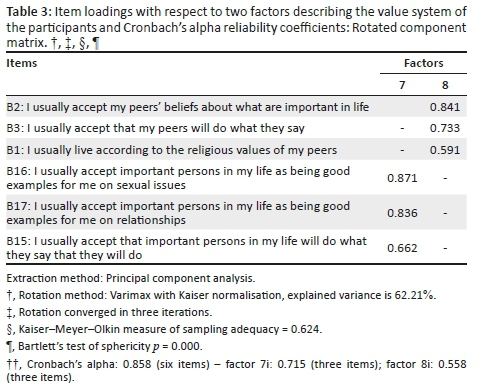 Factor 7i was identified as acceptance of important persons' values (mean = 3.31, SD = 0.90), as it refers to the acceptance of important personal values. Factor 8 was identified as acceptance of peers' values (mean = 3.06, SD = 0.86) (Table 3).